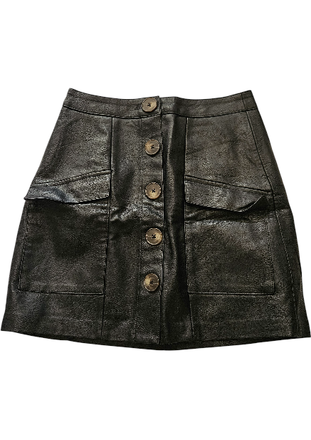 Jupe noire simili cuir avec boutons et poches à l'avant.