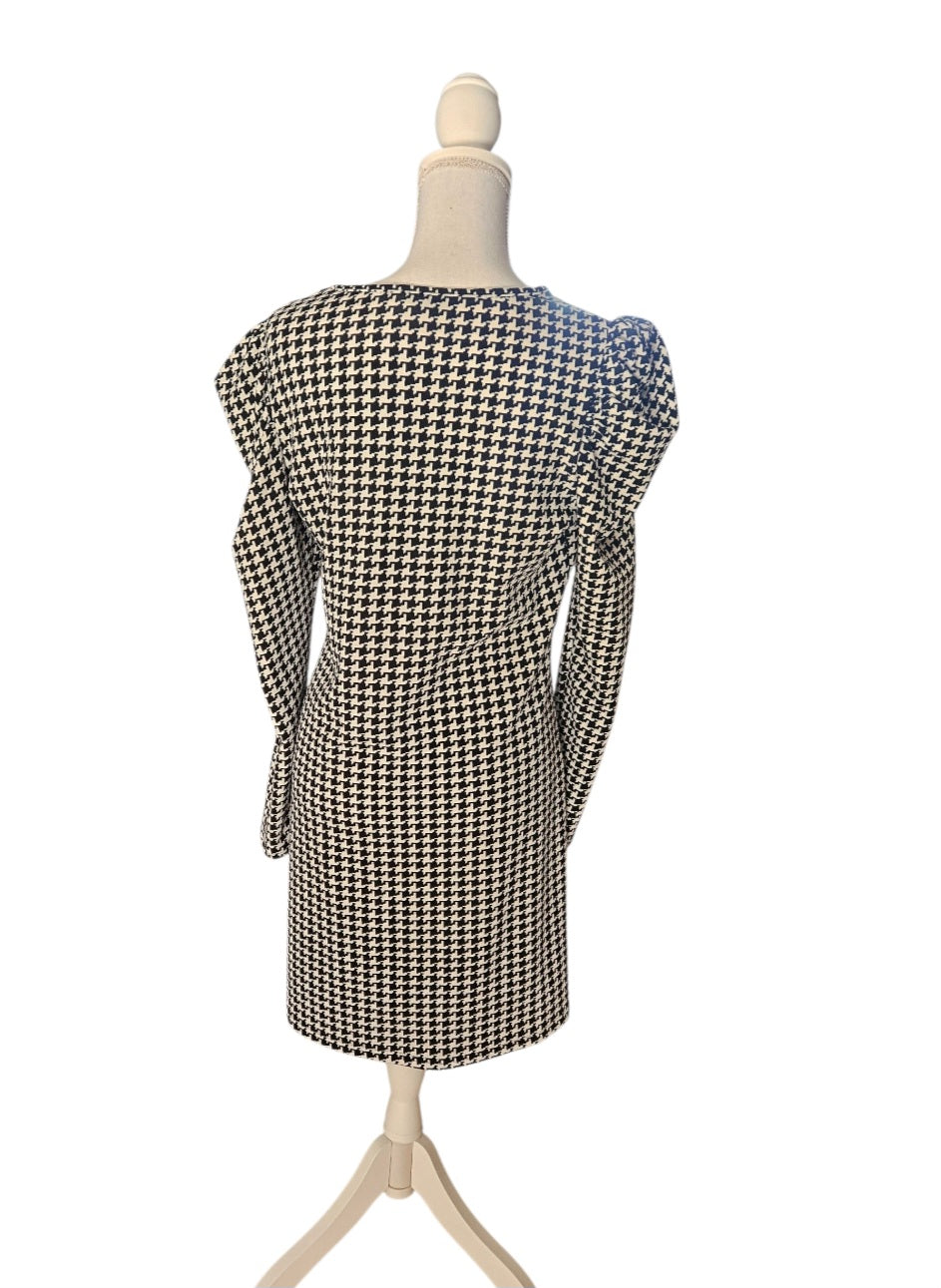 Robe motif pied de poule. Epaules bouffantes et manches longues.